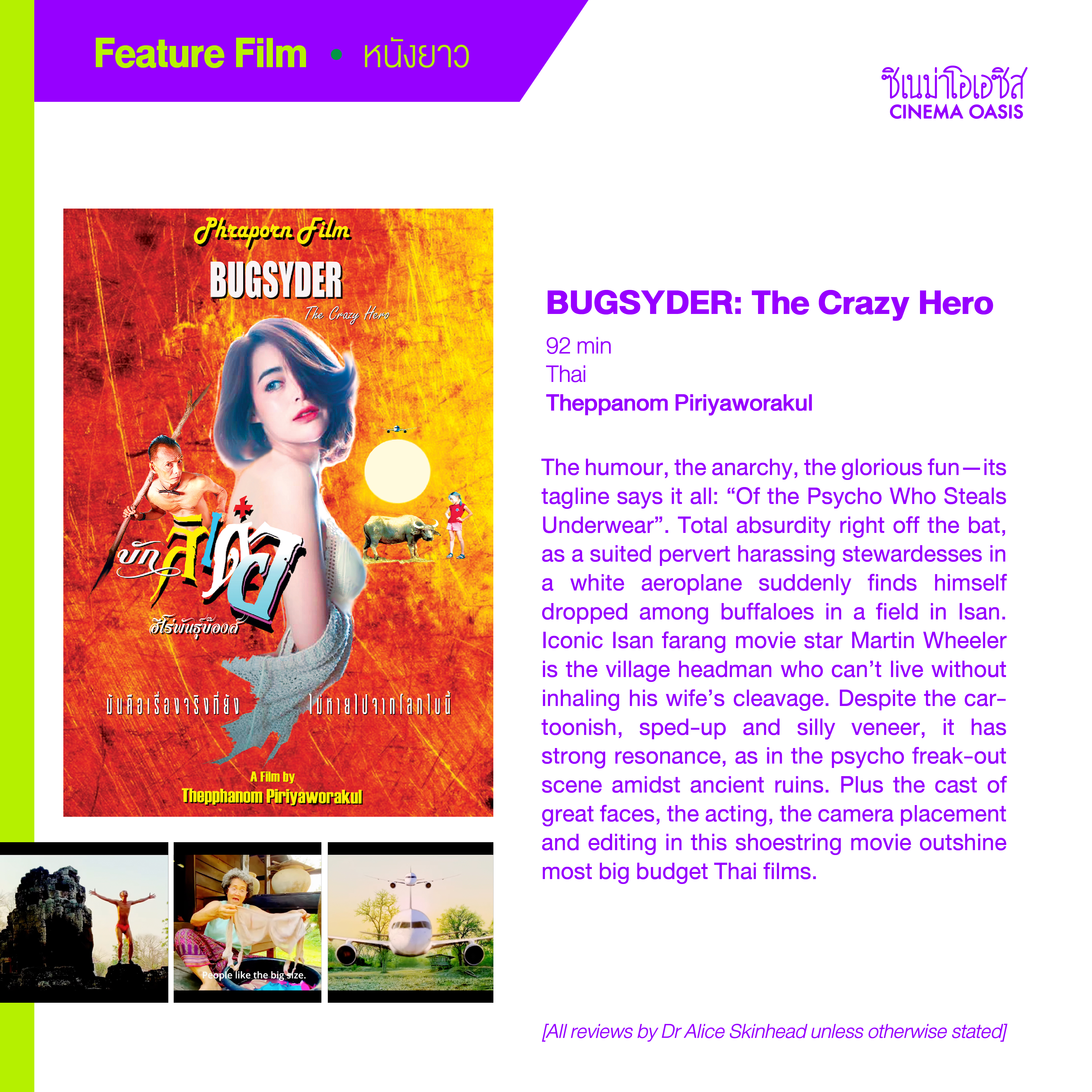 The humour, the anarchy, the glorious fun—its tagline says it all: “Of the Psycho Who Steals Underwear”. Total absurdity right off the bat, as a suited pervert harassing stewardesses in a white aeroplane suddenly finds himself dropped among buffaloes in a field in Isan. Iconic Isan farang movie star Martin Wheeler is the village headman who can’t live without inhaling his wife’s cleavage. Despite the cartoonish, sped-up and silly veneer, it has strong resonance, as in the psycho freak-out scene amidst ancient ruins. Plus the cast of great faces, the acting, the camera placement and editing in this shoestring movie outshine most big budget Thai films.