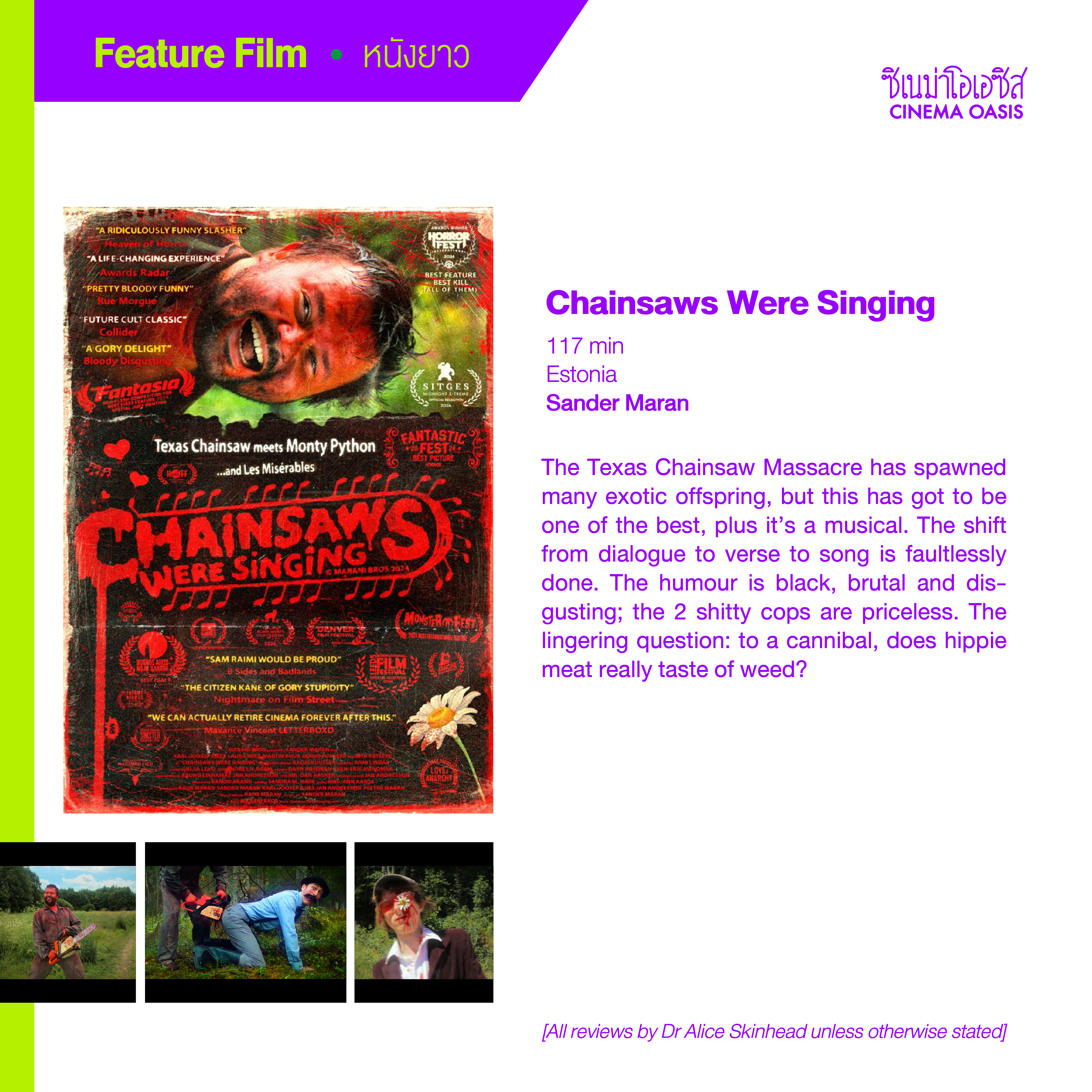 The Texas Chainsaw Massacre has spawned many exotic offspring, but this has got to be one of the best, plus it’s a musical. The shift from dialogue to verse to song is faultlessly done. The humour is black, brutal and disgusting; the 2 shitty cops are priceless. The lingering question: to a cannibal, does hippie meat really taste of weed?
