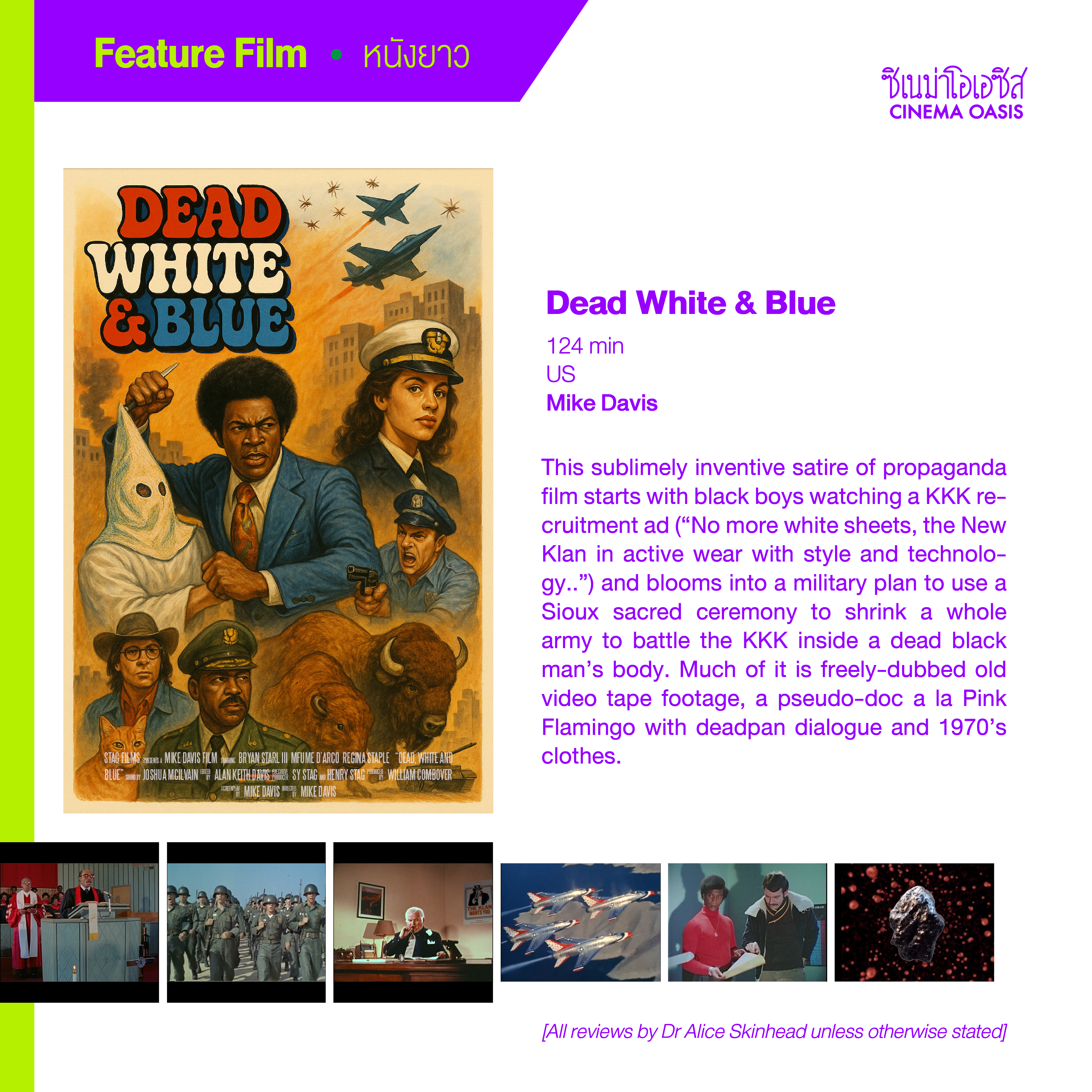 This sublimely inventive satire of propaganda film starts with black boys watching a KKK recruitment ad (“No more white sheets, the New Klan in active wear with style and technology..”) and blooms into a military plan to use a Sioux sacred ceremony to shrink a whole army to battle the KKK inside a dead black man’s body. Much of it is freely-dubbed old video tape footage, a pseudo-doc a la Pink Flamingo with deadpan dialogue and 1970’s clothes.
