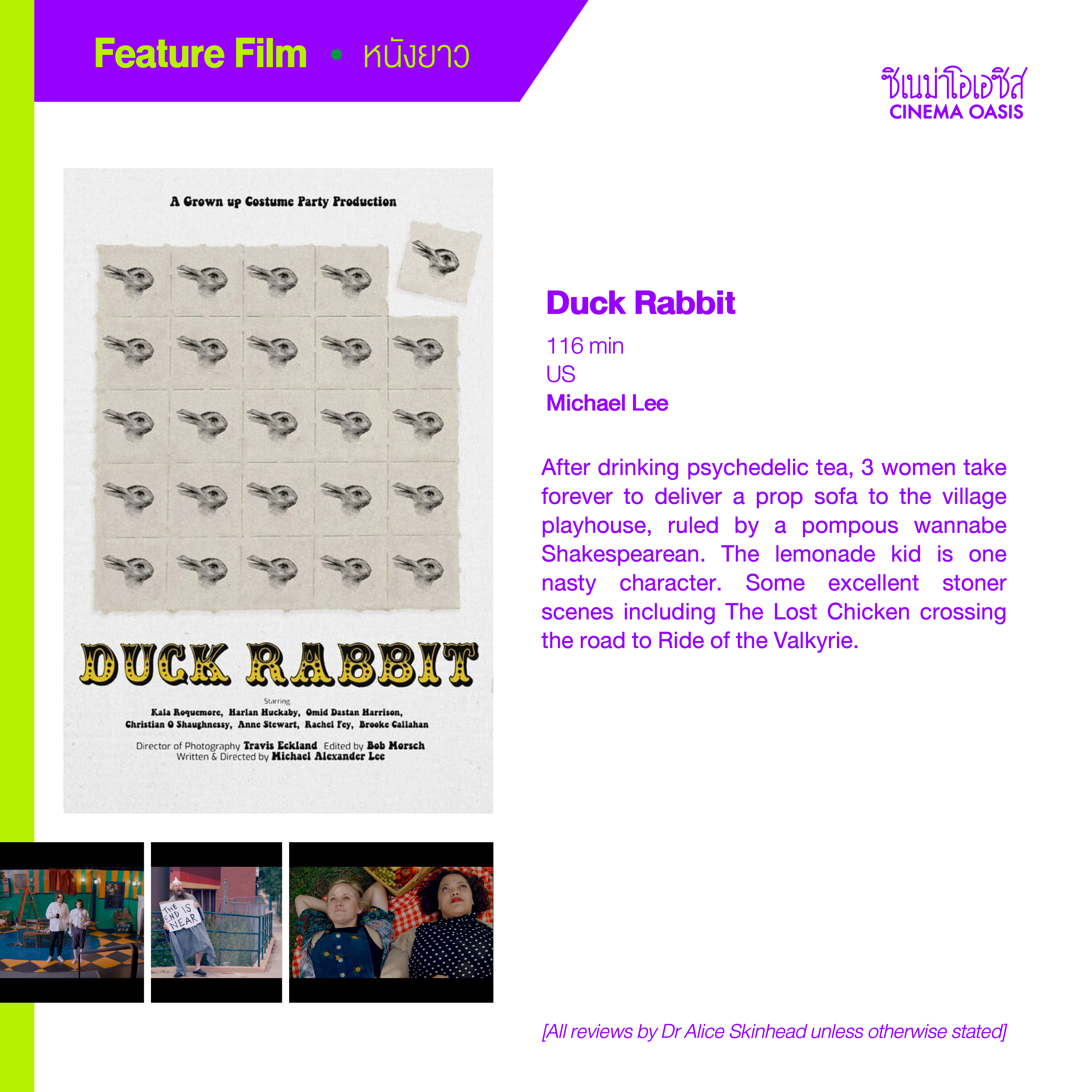 The first bitter V/O lets us know we are in for a treat: “Your work is not daring/too sentimental/not good enough to be enough!” Arrogant art curators Lisa Liu and Susy Something talk pseudo-profound tripe very well and it’s all in Tinglish, the language of Patpong and director Michael’s legendary Iron Pussy. Highlights include the handbag worshippers in ‘E’ masks and sacrilegious burning of books including the Bangkok Art Biennale catalogue. But composer ‘Cookie’ Somtow Sucharitkul steals the show, conducting music in all his naked glory, personifying the tortured artist alone in his cave to chilling effect.