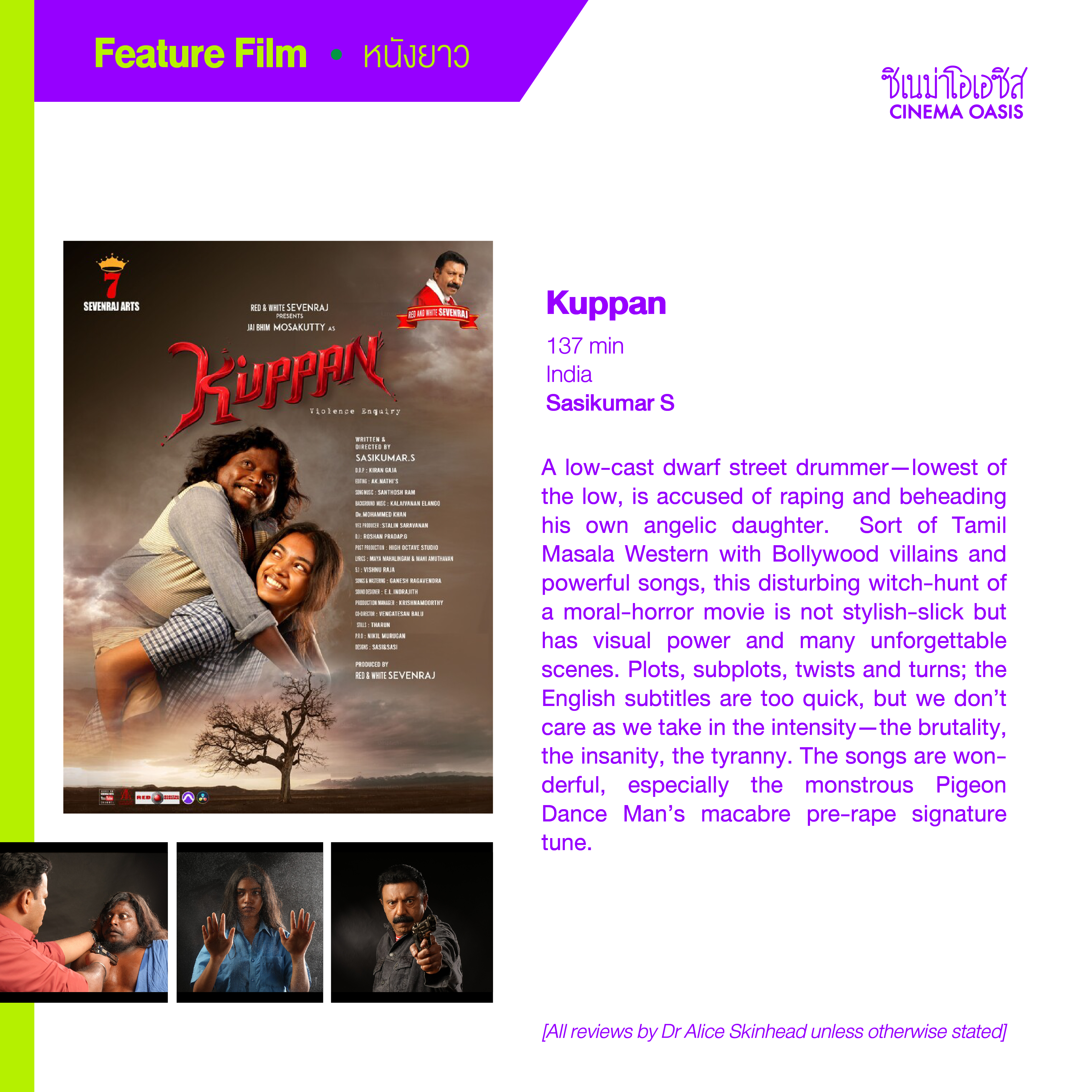 A low-cast dwarf street drummer—lowest of the low, is accused of raping and beheading his own angelic daughter. Sort of Tamil Masala Western with Bollywood villains and powerful songs, this disturbing witch-hunt of a moral-horror movie is not stylish-slick but has visual power and many unforgettable scenes. Plots, subplots, twists and turns; the English subtitles are too quick, but we don’t care as we take in the intensity—the brutality, the insanity, the tyranny. The songs are wonderful, especially the monstrous Pigeon Dance Man’s macabre pre-rape signature tune.