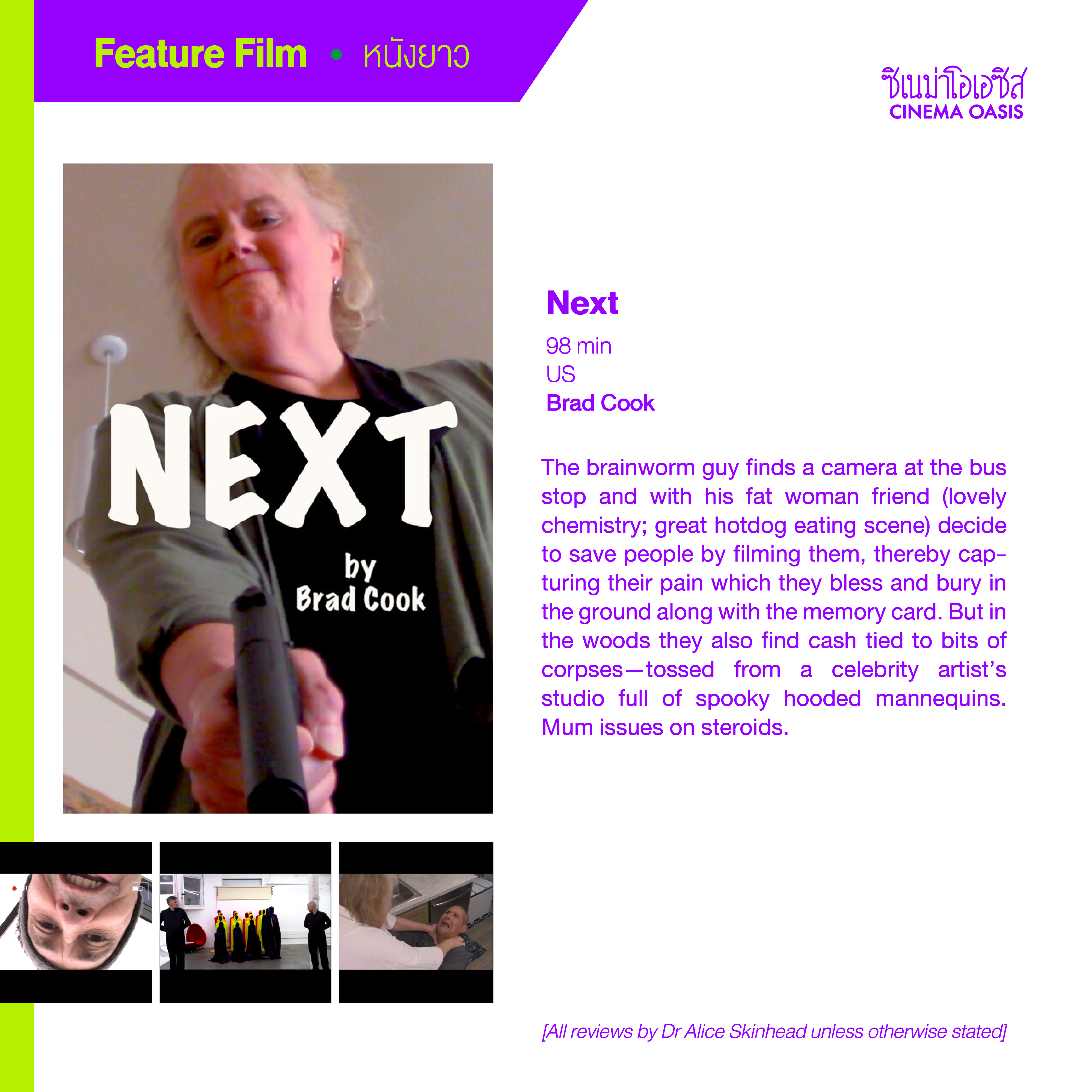 The brainworm guy finds a camera at the bus stop and with his fat woman friend (lovely chemistry; great hotdog eating scene) decide to save people by filming them, thereby capturing their pain which they bless and bury in the ground along with the memory card. But in the woods they also find cash tied to bits of corpses—tossed from a celebrity artist’s studio full of spooky hooded mannequins. Mum issues on steroids.