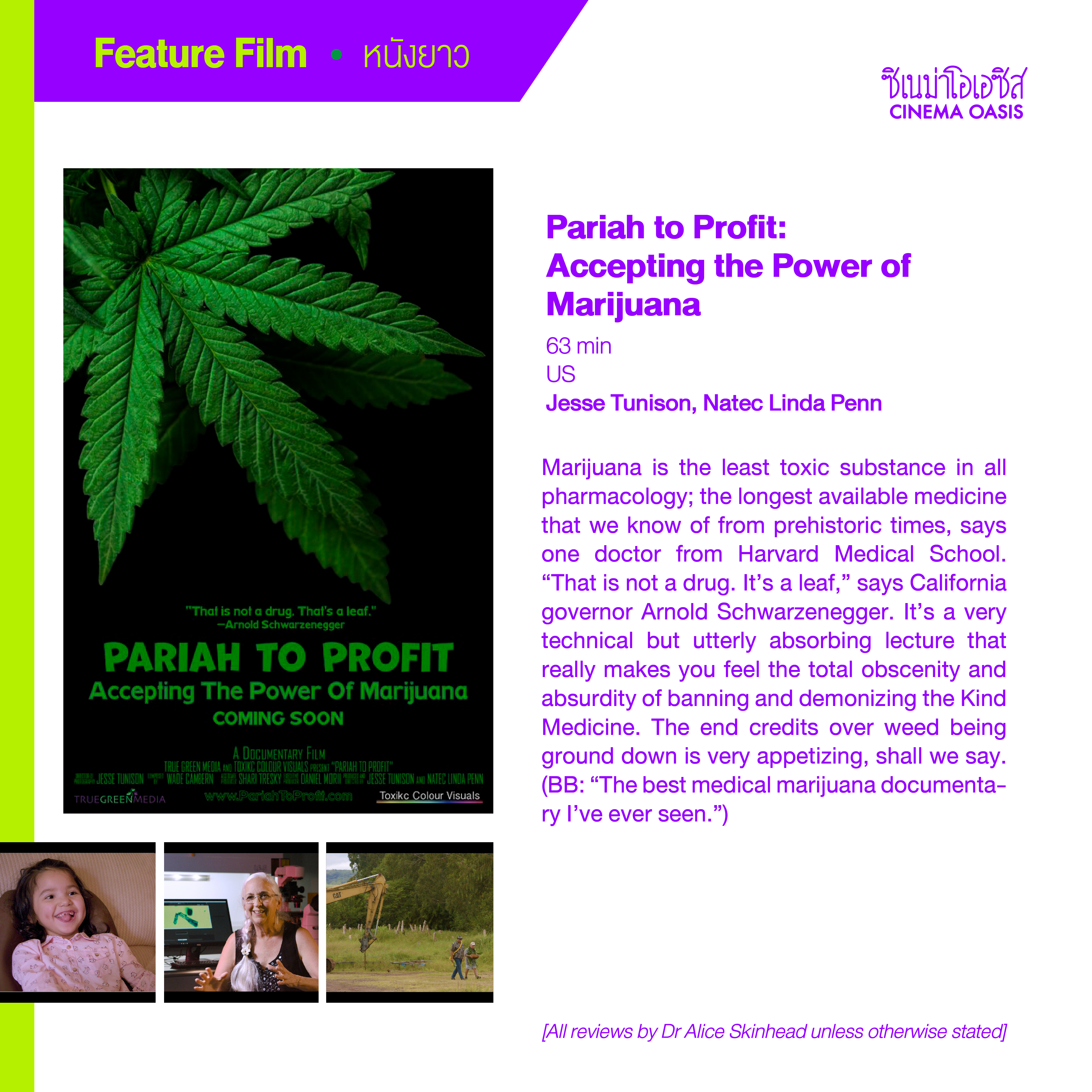 Marijuana is the least toxic substance in all pharmacology; the longest available medicine that we know of from prehistoric times, says one doctor from Harvard Medical School. “That is not a drug. It’s a leaf,” says California governor Arnold Schwarzenegger. It’s a very technical but utterly absorbing lecture that really makes you feel the total obscenity and absurdity of banning and demonizing the Kind Medicine. The end credits over weed being ground down is very appetizing, shall we say. (BB: “The best medical marijuana documentary I’ve ever seen.”)