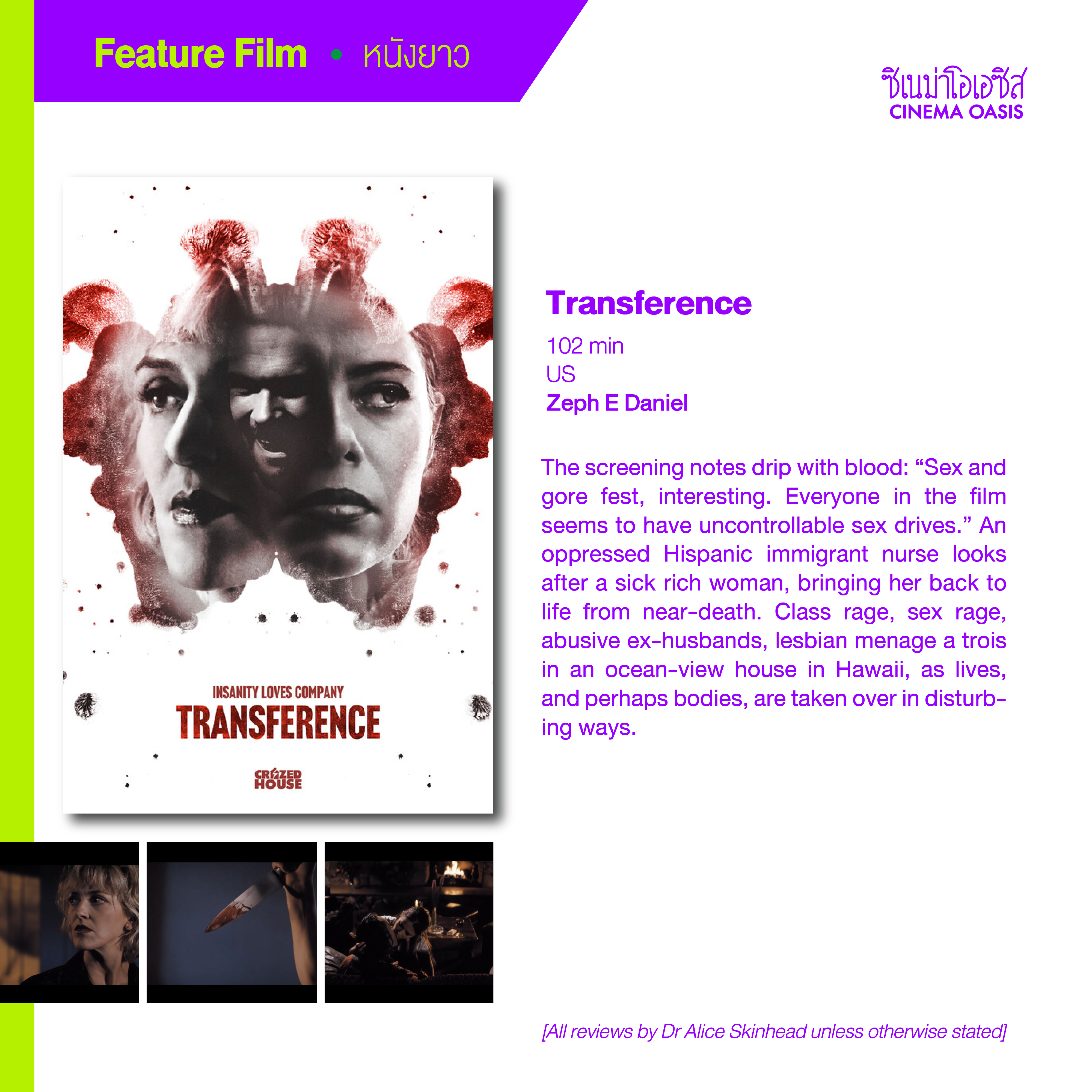 The screening notes drip with blood: “Sex and gore fest, interesting. Everyone in the film seems to have uncontrollable sex drives.” An oppressed Hispanic immigrant nurse looks after a sick rich woman, bringing her back to life from near-death. Class rage, sex rage, abusive ex-husbands, lesbian menage a trois in an ocean-view house in Hawaii, as lives, and perhaps bodies, are taken over in disturbing ways.